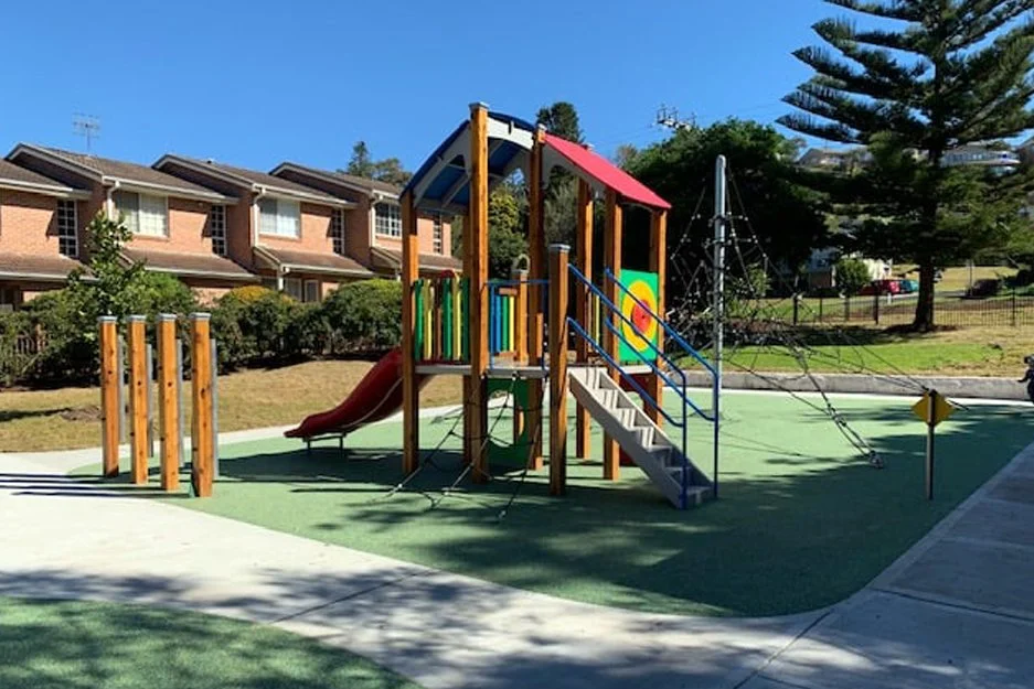 A small, fully fenced playground with softfall surfacing. Play features include a basket swing, low climbing structures, and sound play elements. Level paving links the playground to toilets, seating, barbecues, parking, and a stroll away to The Entrance waterfront.